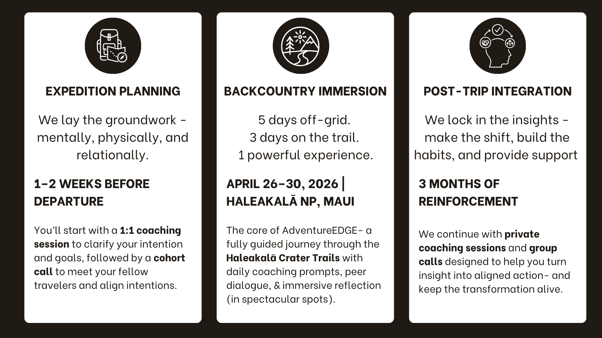 It’s not just about awe-inspiring views or campfire catharsis - it’s a structured, longitudinal coaching journey that includes 1:1 coaching and integration after the hike.This is about change that sticks not just stories for your group chat.