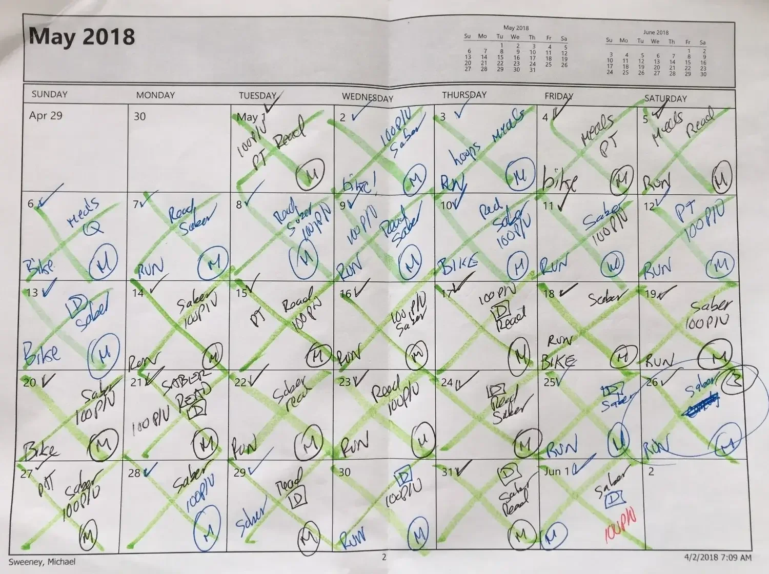 The first few times I tried the strategy, it didn’t work. I’d do 2 things and forget the third. I would go on vacation and completely forget to do anything. So I needed a place where I could keep track every day. I didn’t have a fancy App or automated reminders. I started simple. I printed a calendar and just wrote down the 3 things. If I did 3, I put a green X on the day. If I didn’t, I put a pink circle (no reason – just the only other highlighter I had). And then I tried to keep the chain alive.