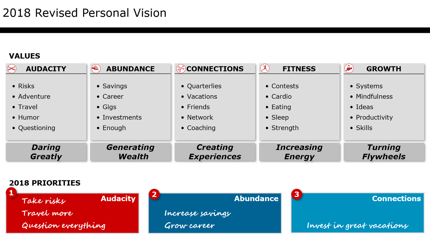 2007 was the first year I started setting goals. The goals were based on what it meant to live a life in alignment with my values. If I wanted to live a life dedicated to Family and be a great father, then I needed to attend the local father’s group and create a system to ensure I have 1:1 time with each daughter (now called out “Quarter Things” - still going strong 12 years later). It seemed pretty simple. Life started to move pretty fast at that point because the flywheel of growth started turning.